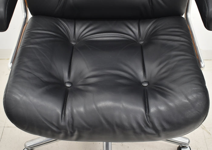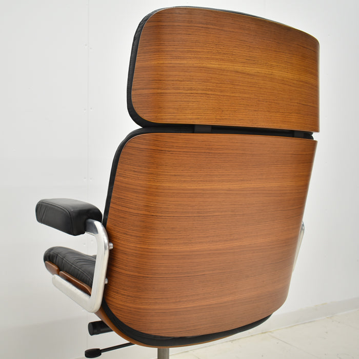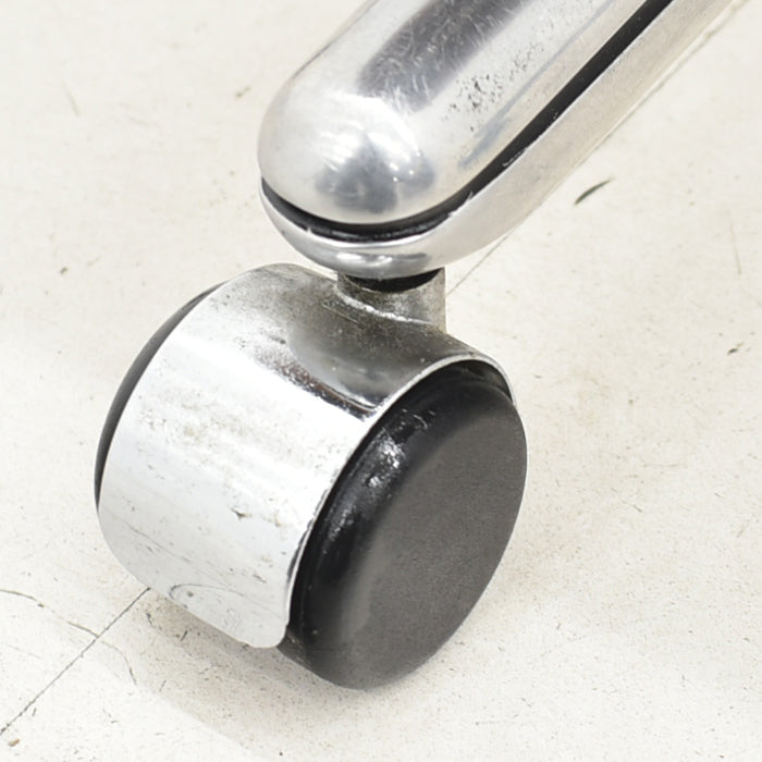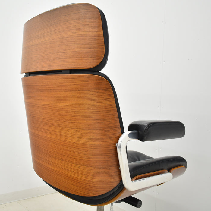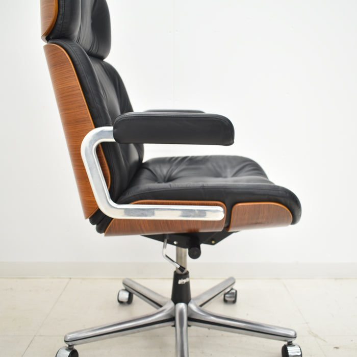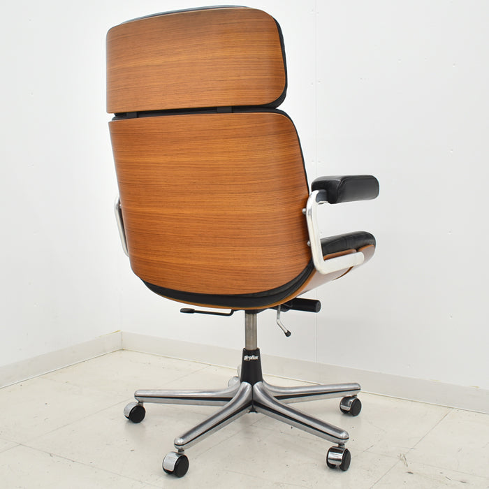 ミッドセンチュリー期にジロフレックス社の最上位モデルとして誕生したパサールは、そのデザインと座り心地の素晴らしさから大変人気の高いオフィスチェアです。現在では生産されていないモデルのため、ヴィンテージ家具として大変希少な椅子となってきました。ボタンダウンの付いた本革製シートや、アルミフレームなど贅沢な素材がふんだんに使用されています。そして座った瞬間に、この椅子が人間工学に基づき座り心地を追求したオフィスチェアであることがわかります。固すぎず柔らかすぎないシートは長時間座っていても疲れにくく、しっかりと背筋をサポートしてくれます。ゆったりと座ることもでき、きびきびと仕事もできるシートの固さです。リラックスするためのロッキング機能は固さの調節もでき、2分割された座面の後ろ部分のみを沈み込ませることで座面の前側が上がらず、その動きの快適さに驚きます。