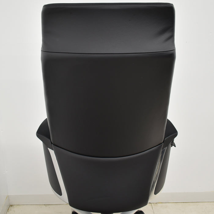 シンプルかつ躍動感のあるデザインに加えて、座面の上下昇降や背もたれの傾斜角度を固定するなどの調節操作レバーを左右の肘部分に集約しました。これにより、腰をかがめて座面下のレバーを探す必要がなくなり、マネジメント層らしいスマートな調節が可能となりました。また、背にエアバックを内蔵し、腰部を支えるランバーサポートのサポート量を空気調整しますので、個人の体形差にあわせた座り心地を実現します。