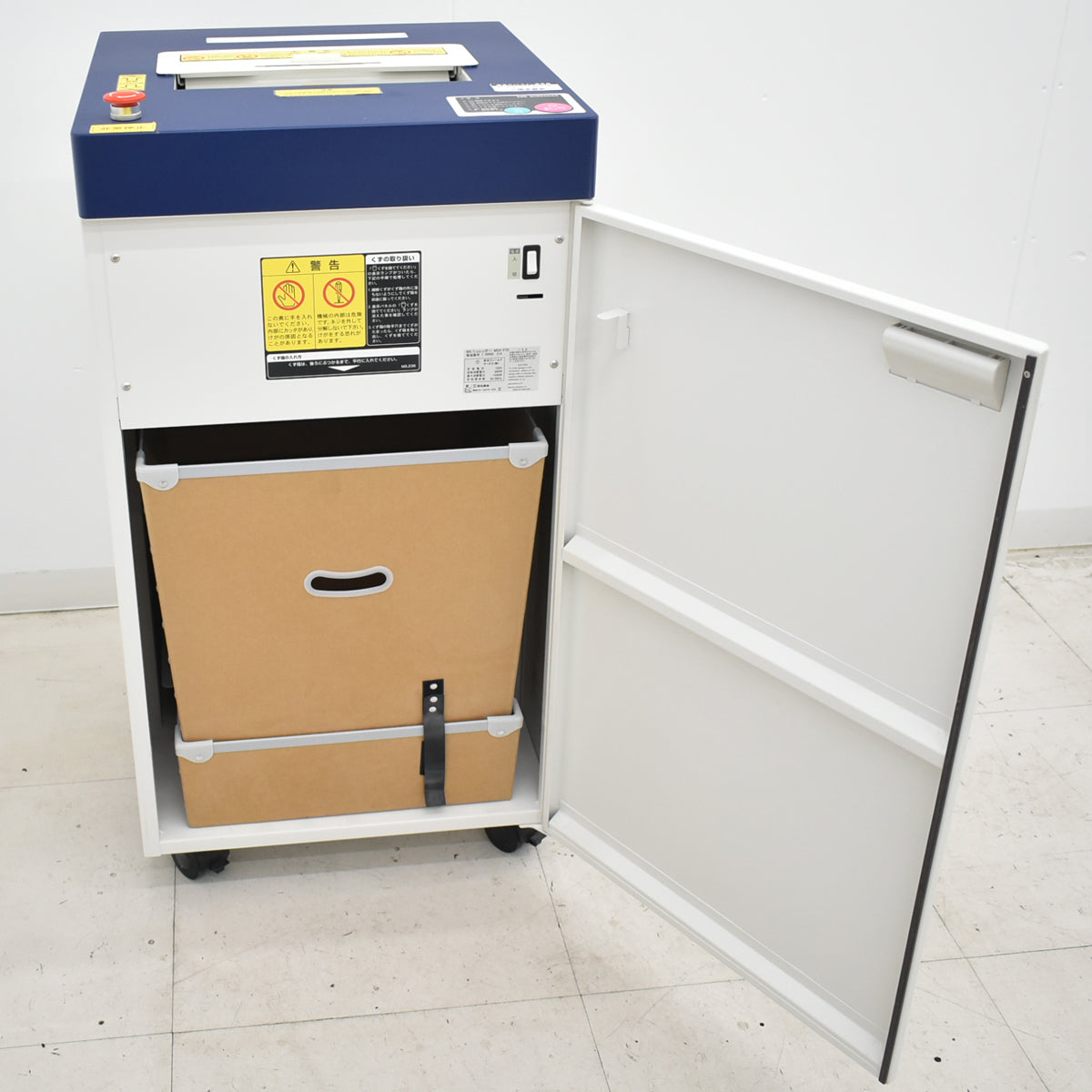 明光商会のシュレッダーです。一度に75枚の細断を実現し、圧倒的パワーを備えた多機能ハイスペックモデルです。 パワークロスカット:高品質な円柱状の特殊鋼を使用し、精密な削り出しにより加工されたカッターは、大量細断向きで、素早くパワフルに書類を処理できます。枚数を多く入れるほど細断時にくずが圧縮されセキュリティ性を高めます(細断サイズ 約 3.9×40mm)。 ●データメディア細断 カード類、CD、FD、MOといったデータメディアの細断が可能で、万全のセキュリティ対策を行えます。メディアトレイをセットすることで細断くずを分別することができます。 ●くずならし機能(ファンプレス) 内蔵レベラーが回転して、細断くずをくず箱に均等に落としていき、さらに一定量のくずが溜まると隙間をうめるようにならしていきます。これにより、くずこぼれを格段に軽減させ、オーバーフローストップ(くず箱が満杯になると自動的に運転を停止する機能) ●非常停止スイッチ ユーザーの安全のために、天面の左手前に大きくわかりやすい非常停止スイッチを備えています。スイッチを押すと緊急停止し、スイッチを右に回転させると元に戻り、再スタートボタンを押すことで再度使用できます。 ●グラデーションランプ 細断する紙の投入量に応じて色が変化し、過投入による紙詰まりを防止します。投入前の電源ON時は「青」、投入後の最適枚数時は「緑」、多めの時は「黄」~「橙」~「赤」と色が変化します。「緑」の状態で使用して頂くのが理想です。 ●パワフル大量細断 高品質な円柱状の特殊鋼を精密な削り出しにより加工したカッターで、素早くパワフルに書類を細断します。モーターからのパワーを効率良く使用して長時間、安定的に大量の細断が可能です。メディアの細断も対応しています。 ※天板の塗装が浮いているのか凹凸がある部分があります。 ※アートセッティングデリバリー(家財おまかせ便)でのお届けとなります。 ※送料はお見積りとなります。 クリーニングとメンテナンスをしっかり行ってお届けします。 この商品の程度は中古品として美品といえます。 多少の擦れや傷はあるものの気になる程ではないでしょう。 御使用端末の環境により多少画像の表示色と実物の色に差違が生じる場合がございますのでご了承ください。 |
